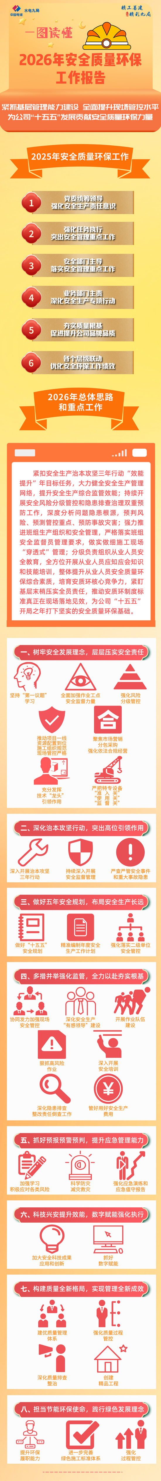 1月31日,水电九局召开2026年安全质量环保工作会,党委委员、总工程师王军作题为《紧抓基层管理能力建设 全面提升现场管控水平为公司“十五五”发展贡献安全质量环保力量》的工作报告,下面通过一图读懂报告精神吧~