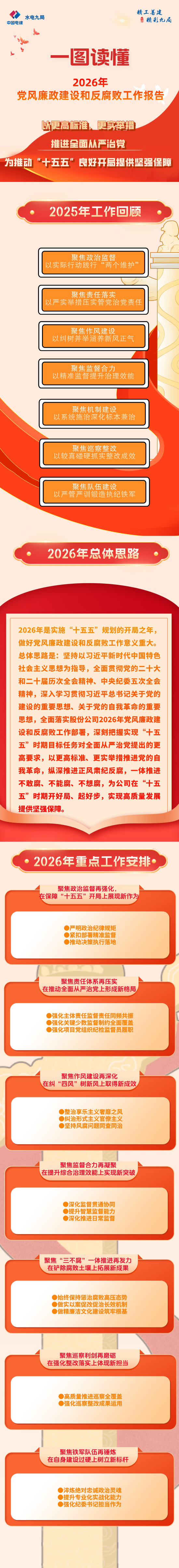 1月31日,水电九局召开2026年党风廉政建设和反腐败工作会议暨警示教育大会。党委委员、纪委书记温海岩作题为《以更高标准 更实举措推进全面从严治党 为推动“十五五”良好开局提供坚强保障》的工作报告。下面通过,一图读懂报告精神吧 。