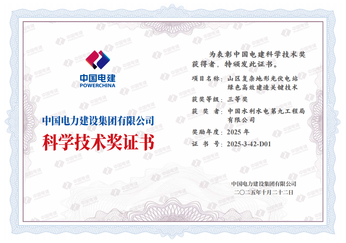 近日,2025年度中国电建科学技术奖评选结果揭晓,水电九局申报的《山区复杂地形光伏电站绿色高效建造关键技术》科技成果荣获三等奖。 该项目立足“陡坡运输-柔性支架-生态约束”三元耦合作用机制,突破传统粗放式施工范式,通过构建地形自适应施工装备链与全过程生态工法,实现陡坡光伏工程在“机械化作业效能、结构精度控制、生态扰动阈值”三大维度的协同跃升。研究成果将填补复杂地形光伏集约化施工技术空白,推动行业从“场地平整优先”向“地形智能响应”的建造模式转型,为“双碳”目标下光伏规模化开发提供核心支撑。项目研究成果已成功应用于华能南华吕合煤矿排土场50.4兆瓦光伏发电工程EPC总承包项目等工程。经中国电建鉴定委员会专家鉴定认为,项目成果达到国际先进水平。 荣誉的背后,是科研团队对创新与技术突破的不懈追求,是产学研深度融合的生动实践。下一步,水电九局将继续秉持“创新驱动发展”理念,加速科技成果转化,为构建清洁低碳、安全高效的现代能源体系贡献更多“九局智慧”。 |