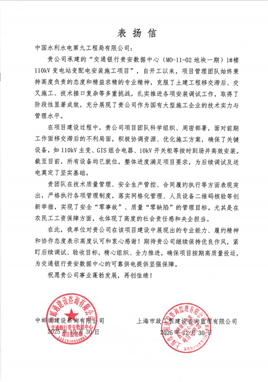 12月30日,水电九局交通银行贵安数据中心项目顺利达成设备安装节点目标,业主单位与监理单位联合发来表扬信,对项目部顺利完成节点目标表达了诚挚感谢与热烈祝贺。 施工期间,交通银行贵安数据中心项目部面对前期工作面移交滞后、交叉施工、技术接口复杂等诸多挑战,积极调配资源、优化施工方案,保障了110千伏主变、GIS组合电器、10千伏开关柜、电容器等关键设备按时到场并高效安装,提前完成了施工任务,为后续调试及送电奠定了坚实基础。 下一步,水电九局将以此为新起点,坚持高标准、高水平、高质量推进交通银行贵安数据中心项目建设,紧盯后续调试、验收目标,确保项目按时高质量投运,为交通银行贵安数据中心的安全供电提供有力保障。 |