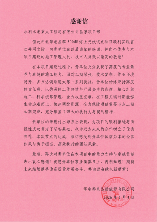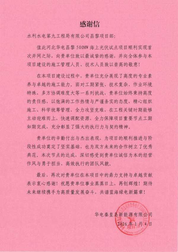 近日,水电九局河北昌黎海上光伏项目部顺利完成首并节点目标,并收到业主单位发来的感谢信,在信中对水电九局项目部顺利完成节点目标,表示诚挚的感谢与热烈的祝贺。 项目建设过程中,面对工期紧张、技术复杂、作业环境特殊、多方协调难度大等系列挑战,水电九局项目团队始终秉持高度的责任感,以饱满的工作热情与严谨务实的态度,精心组织施工、科学统筹管理、全力攻坚克难,在工程关键时期能够主动迎难而上,快速调配资源,全力保障项目重要节点工期如期完成,为项目的后续整体施工奠定了坚实基础。 下一步,水电九局项目部将会继续以高标准、严要求推进昌黎海上光伏项目的后续建设工作,着力将昌黎海上光伏项目打造成为行业标杆工程,为我国海上光伏产业的发展贡献更多的智慧和力量,助力国家实现碳达峰、碳中和目标,推动能源绿色低碳转型。 |