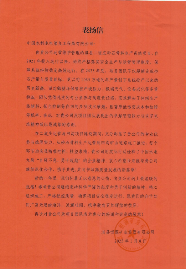 近日,水电九局收到业主单位发来的表扬信,在信中对水电九局2025年度超额完成砂石产量与质量目标,更以1065万吨的年产量创下系统投产以来的历史新高,表示诚挚的感谢与热烈的祝贺。 在二道庄砂石系统项目的运营与田沟项目的建设期间,面对鹤壁环保管控严峻压力、极端天气、设备老化等多重挑战,水电九局项目团队凭借扎实的专业素养与高度责任感,高效解决了包括生产线堵料、扬尘控制等在内的多项技术难题,显著降低运营成本和故障停机率。从砂石骨料生产运营到田沟矿山道路施工推进,项目团队用实际行动诠释了水电九局“自强不息、勇于超越”的企业精神。 下一步,水电九局将继续秉持科学严谨的态度和勇于创新的精神,精心组织施工,严格把控质量,确保项目安全稳定运行,研究开发更加高效、节能、环保的生产设备和工艺,降低生产成本,提高产品质量,通过打造高质量的项目,树立行业良好品牌形象,赢得客户的信任和市场的认可。 |