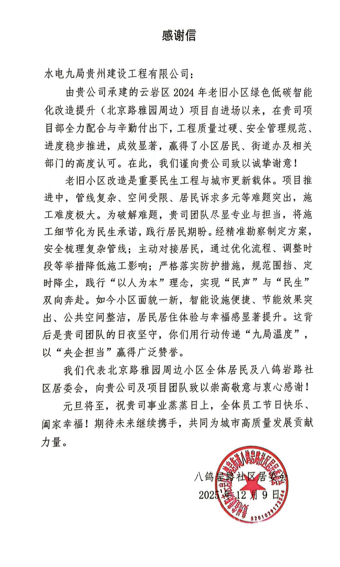 12月9日,水电九局贵阳云岩区2024年老旧小区绿色低碳智能化改造提升(北京路雅园周边)项目部,收到贵阳市八鸽岩路社区居委会发来的感谢信。信中对工程成效给予高度评价,盛赞项目实现“民声”与“民生”双向奔赴,显著提升居民生活品质。 老旧小区改造是提升城市品质、改善民生福祉的重要举措。北京路雅园周边项目聚焦居民急难愁盼问题,通过优化公共空间布局、增设智能安防设施、升级节能环保系统等措施,彻底改变了小区昔日环境脏乱、设施老旧的面貌。如今,小区内道路平整宽敞,绿化景观错落有致,智能门禁、垃圾分类回收站等便民设施一应俱全,居民生活便利性大幅提升。 “以前楼道灯不亮,现在感应灯随走随亮;过去停车难,如今智能车位规划有序。”居民王阿姨的感慨,正是项目团队践行“以人民为中心”理念的生动注脚。项目团队广泛征集民意,将群众需求转化为改造清单,让工程既接地气更有温度,实现居民从“忧居”到“优居”的蝶变。 工程建设过程中,水电九局高度重视,项目部全员投入,与街道办、居委会及居民代表建立了紧密协作机制。通过定期召开协调会、设立意见反馈渠道,项目团队及时解决施工中的矛盾问题,确保工程进度与质量双达标。八鸽岩路社区居委会在感谢信中特别提到,项目团队“用行动传递“九局温度”,以“央企担当”赢得广泛赞誉”。街道办相关负责人表示:“老旧小区改造不仅是硬件升级,更是基层治理能力的提升。通过政企民三方联动,我们探索共建共治共享的社区治理新模式。” 此封感谢信既是对过往成绩的肯定,更是对未来工作的鞭策。云岩区老旧小区改造正从“点上开花”走向“面上成景”,水电九局将始终秉持“人民至上”理念,在后续项目中继续发扬匠心精神,为提升城市宜居水平、推动绿色发展贡献力量。 |