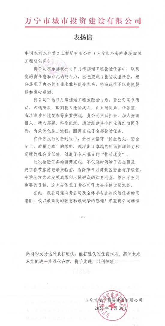 1月31日,水电九局万宁小海防潮堤加固工程总包部收到业主单位万宁市城市投资建设有限公司发来的表扬信,对项目部在参与日月湾护岸塌陷应急抢险工程中的优异表现表示高度赞扬和衷心感谢。 表扬信中提到,此次应急抢险工程时间紧、任务重、作业环境复杂等多重挑战。紧急时刻,项目部闻令而动,火速响应,加大资源投入,以高效执行力创造出令人瞩目的“抢险速度”,充分展现了央企的专业水准和使命担当,更在春节旅游旺季前,保障了景区的安全有序运营、守护地方文旅发展成果和人民群众生命财产安全。 下一步,水电九局项目部将以此次表彰为契机,把表扬信的鼓励转化为干事创业的强大动力,以更坚定的决心、更务实的作风,践行央企的责任担当,为服务万宁市经济社会高质量发展、守护地方民生安全贡献力量。 |